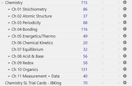 Hello! Here you can find all 715 IB Chemistry Standard Level Anki flashcards that I created myself over the 2 years of the International Baccalaureate Programme. These flashcards, along with several past papers, should guarantee any Chemistry SL student a comfortable 7. These flashcards tackle every single dotpoint in the IB Chemistry SL syllabus.